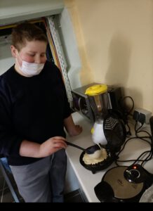 Nach kurzer Ruhezeit ging es auch schon ans Backen. Unser Paul erwies sich dabei als Chef-Bäcker ziemlich gut, aber auch die anderen Mitglieder unserer AG stellten sich sehr geschickt am Waffeleisen an. Schon nach kurzer Zeit konnten wir im Häppchen-Raum die selbstgebackenen Waffeln mit Nutella und Puderzucker verputzen.