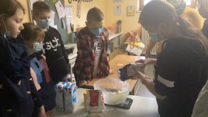 Nach dem Rezept der HäppchenSAG versuchten wir uns dann gemeinsam unter Anleitung von Mareike Barner (Klasse 10c) am Teigzubereiten.