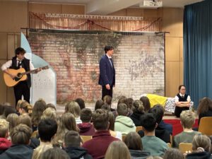 Für die Klassen 7 bis 9 wurde das Stück „Sticks and Stones“ aufgeführt. Es wurde vor 26 Jahren vom Gründer des White Horse Theatre geschrieben und in Zusammenarbeit mit dem Regisseur an die Interessen der heutigen Jugendlichen angepasst.